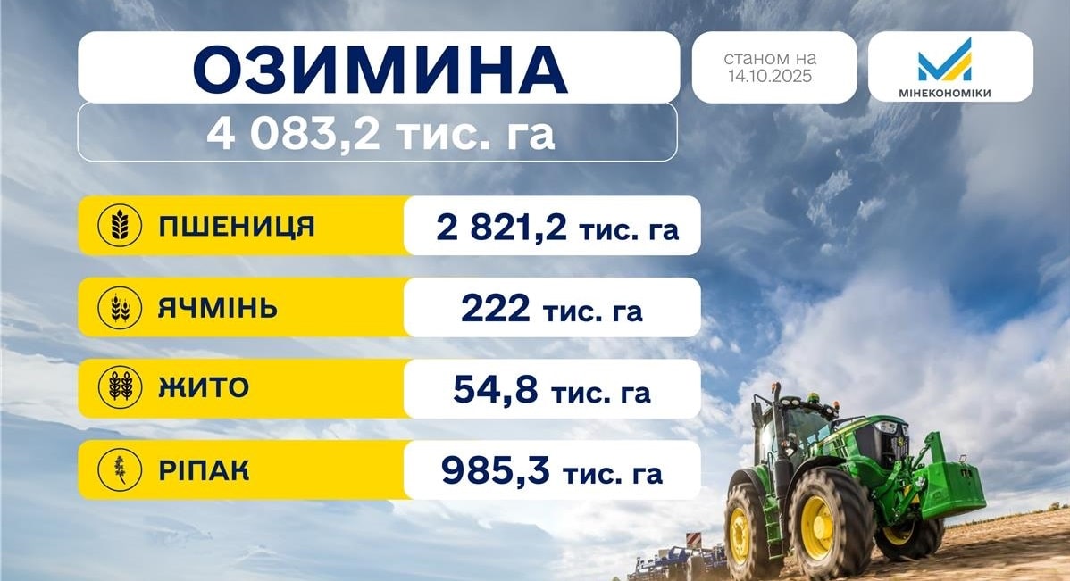 Станом на 14 жовтня 2025 року українські аграрії засіяли 4 083,2 тис. га озимих культур. Це 62% від прогнозованих площ.