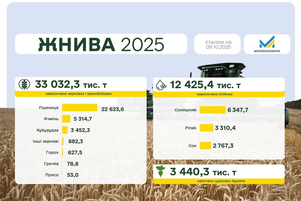 Станом на 10 жовтня 2025 року в Україні вже зібрано 33 032,3 тис. тонн зернових культур на площі 7 673,9 тис. га. Обмолочено 67% площ, засіяних цими культурами.