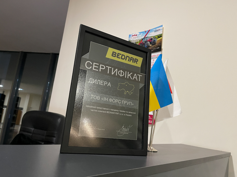 Як повідомляє пресслужба BEDNAR, компанія прийняла рішення розширити дилерську мережу в Україні та розпочала співпрацю з компанією ІН ФОРС ГРУП, яка стала офіційним дилером BEDNAR FMT. Компанія буде представляти техніку BEDNAR, проводити її технічне обслуговування та забезпечувати оригінальними запчастинами в регіонах, де має свої представництва, а саме: в Полтавській, Дніпропетровській, Запорізькій, Львівській та Тернопільській областях.