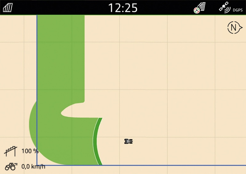 Вигляд GPS на повороті без CurveControl. Віяло розподілу знаходиться на відстані кількох метрів за трактором, виникають небажані коливання