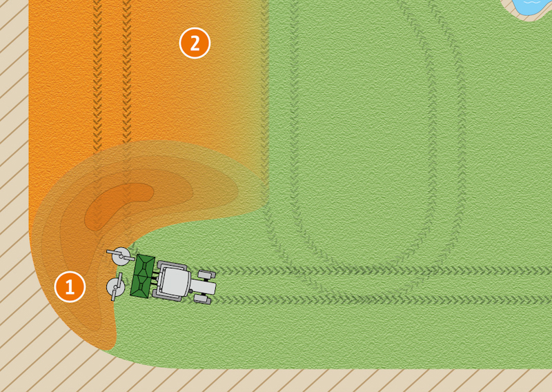 Опційне ПЗ CurveControl на відцентрових розподільниках адаптує поперечний розподіл добрив при проходженні поворотів до різної швидкості руху та коригує зміщення картини розподілу. Результатом є більш рівномірні посіви, запобігання небажаному надлишку добрив на внутрішній стороні повороту, а також їх розподіленню за межі поля.