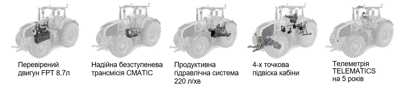 • Комплектація, що включає автоматичну трансмісію, 4-точкову підвіску кабіни, компресор та пневматичні гальма, повний комплект баластів, джойстик управління CMOTION, телеметрію TELEMATICS на 5 років.