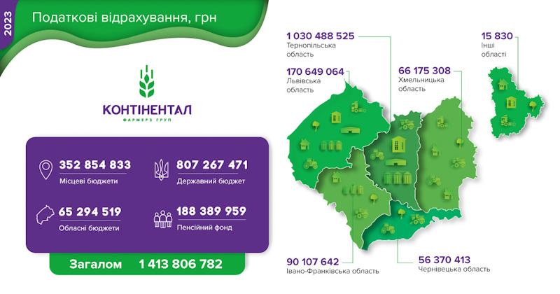 Cума податкових відрахувань, які Компанія сплатила до бюджетів усіх рівнів торік, сягнула 1,4 млрд грн. З цими результатами «Контінентал» увійшов до списку найбільших платників податків за 2023 рік у галузі українського АПК.