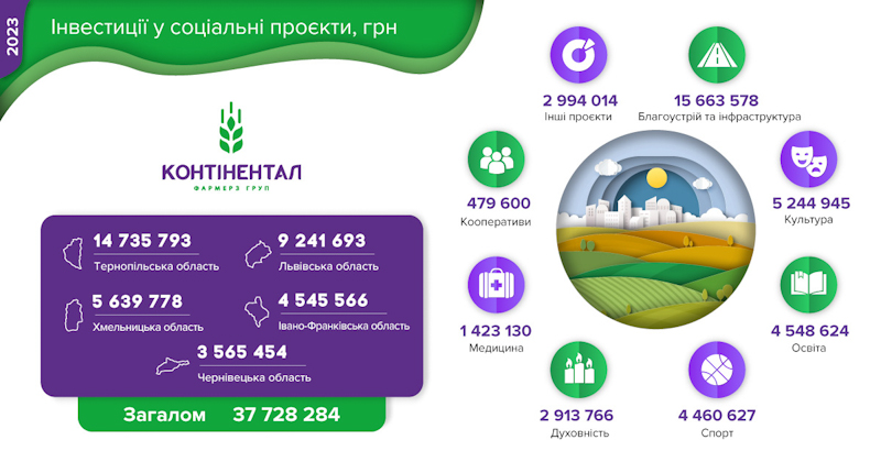 Попри складний для країни час, «Контінентал Фармерз Груп» продовжила спрямовувати соціальні інвестиції на розвиток місцевих громад, неухильно й у повному обсязі виконуючи взяті на себе зобов’язання. Загалом за 2023 рік на територіях своєї присутності Компанія реалізувала соціальних проєктів на суму 37,7 млн грн. Вагомими статтями соціальних інвестицій торік стали проєкти у сфері благоустрою та інфраструктури. Крім того, було втілено освітні й культурні ініціативи для молоді, серед яких «Розумний город» і «Великодня веселка».
