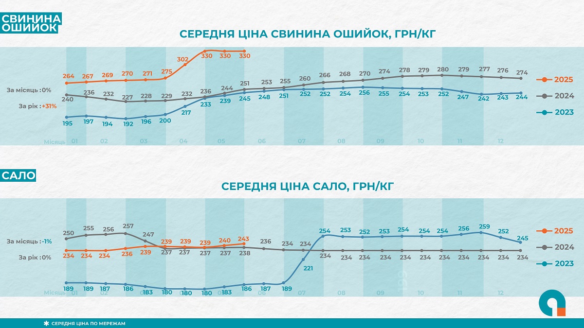 Водночас ціна на свинячий ошийок залишилася стабільною на рівні 330 грн/кг, що, однак, на 31% перевищує минулорічний показник.