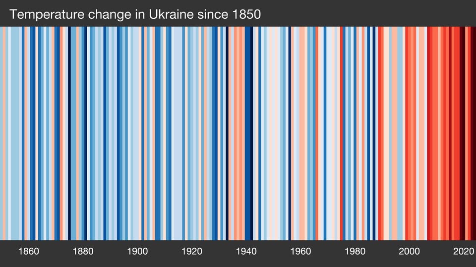Днями український гідрометеорологічний центр продемонстрував просту візуалізацію змін температури: кожна «кліматична» смуга — один рік, колір — від холодного до теплого. За останні десятиліття Україна майже повністю «в червоній зоні».