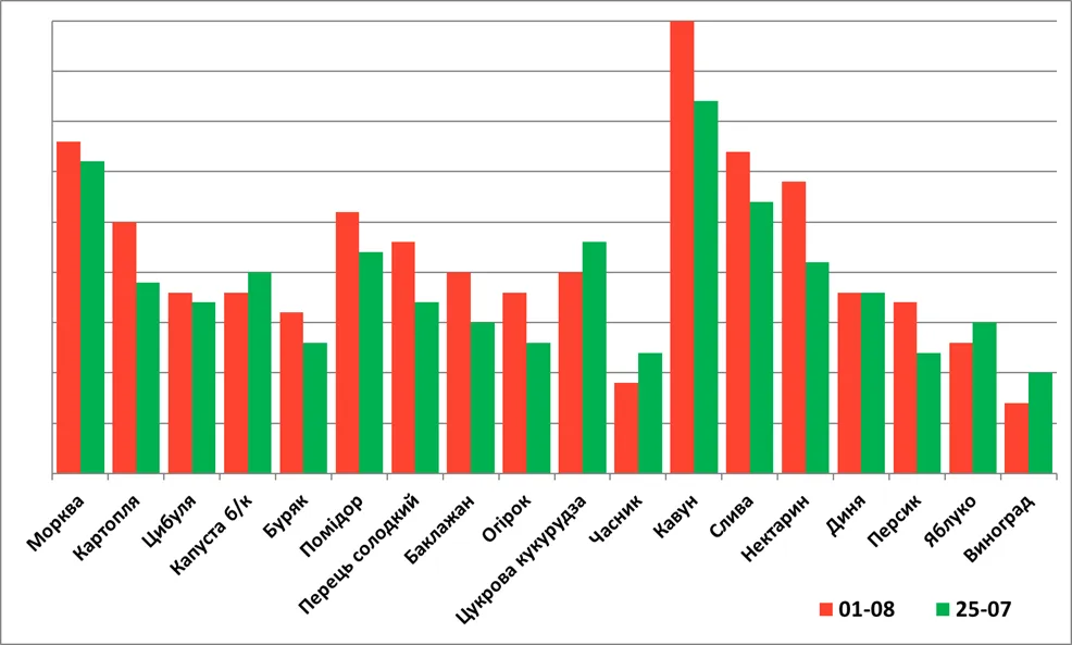 А рік тому в цей же час лідером продажів також був кавун, якому було присвячено кожне 7 оголошення розміщене на майданчику. Вдвічі збільшилася кількість продавців дині. Зростала пропозиція винограду з Узбекистану. В овочевому сегменті переважали продажі томату. Столові буряки та білокачанна капуста не потрапляли в топ. При цьому буряк в Україні коштував дешевше, а капуста дорожча, ніж сьогодні.