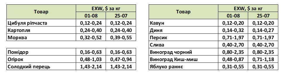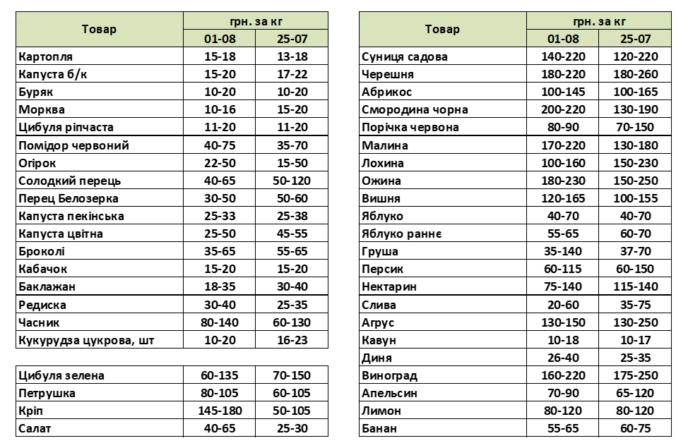 Ціни на ягоди та фрукти також змінилися різноспрямовано. Суниця садова подешевшала, а малина подорожчала. Діапазон цін на ожину звузився. Збір лохини досяг піка, що змушує продавців і далі знижувати відпускні ціни. Чорна смородина почала продаватися дорожче, а порічка продовжує дешевшати. Кісточкові фрукти за винятком вишні подешевшали. Почала дорожчати диня. Зростання пропозиції яблука ранніх сортів призвело до зниження цін. З тієї ж причини почав дешевшати виноград. У сегменті імпортної продукції знизилася вартість банана та звузився діапазон цін на апельсин.