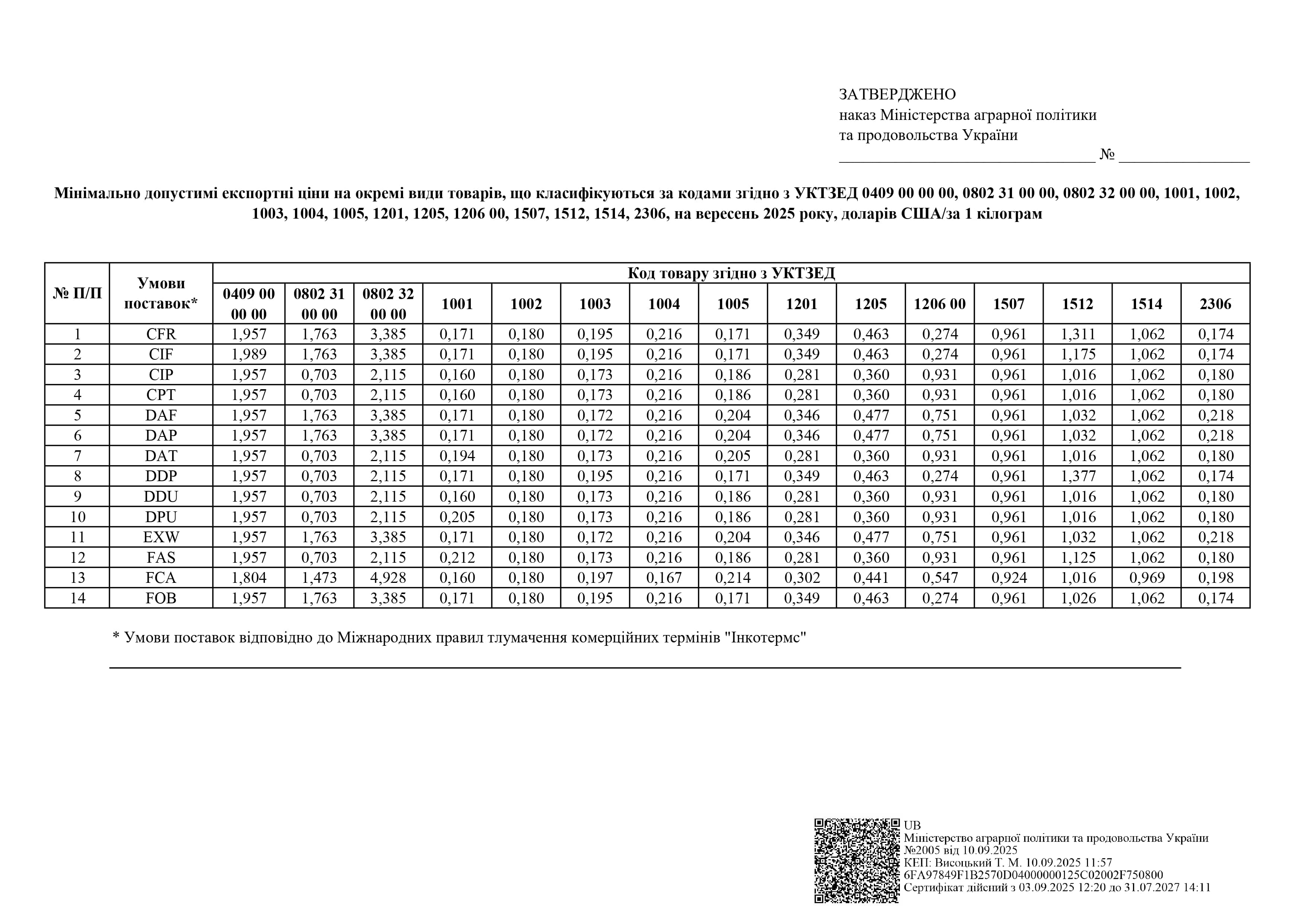 Міністерство економіки, довкілля та сільського господарства України визначило мінімальні ціни на сільгосппродукцію, стосовно якої діє режим експорного забезпечення.