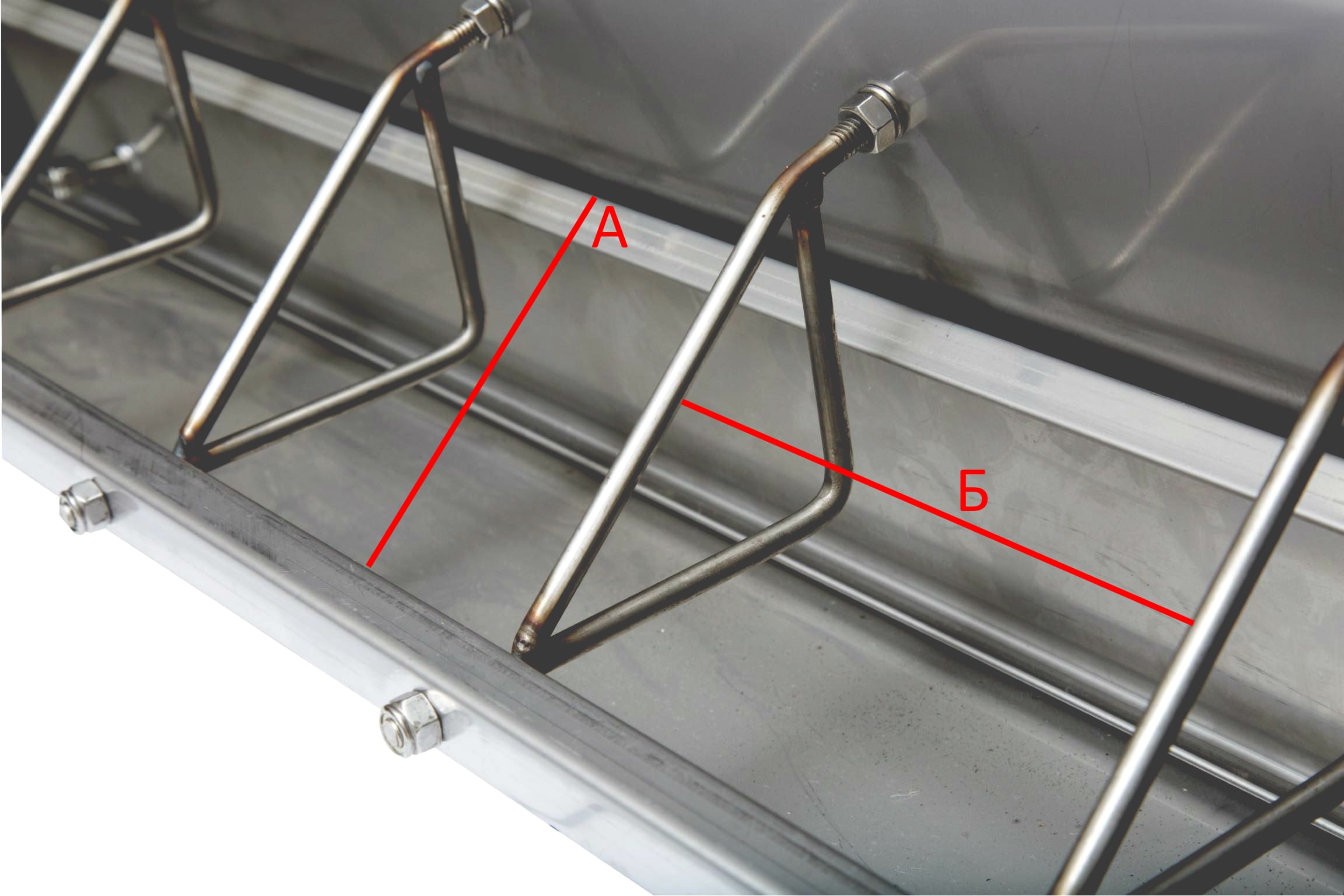 Оптимальний розмір кормового місця (мається на увазі відстань між перегородками (Б на фото)) для поросят на дорощуванні (до 27 кг): 19.5 см. На відгодівлі оптимальний розмір кормо місця: 30 см.