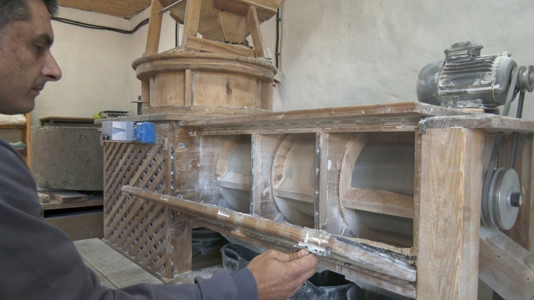 За словами чоловіка, помел зерна здійснюється за допомогою кам’яних жорен. Після перемелювання борошно потрапляє до просіювача, де воно розділяється на гатунки: вищий, перший, другий і висівку. Також є можливість отримати непросіяне цільнозернове борошно.