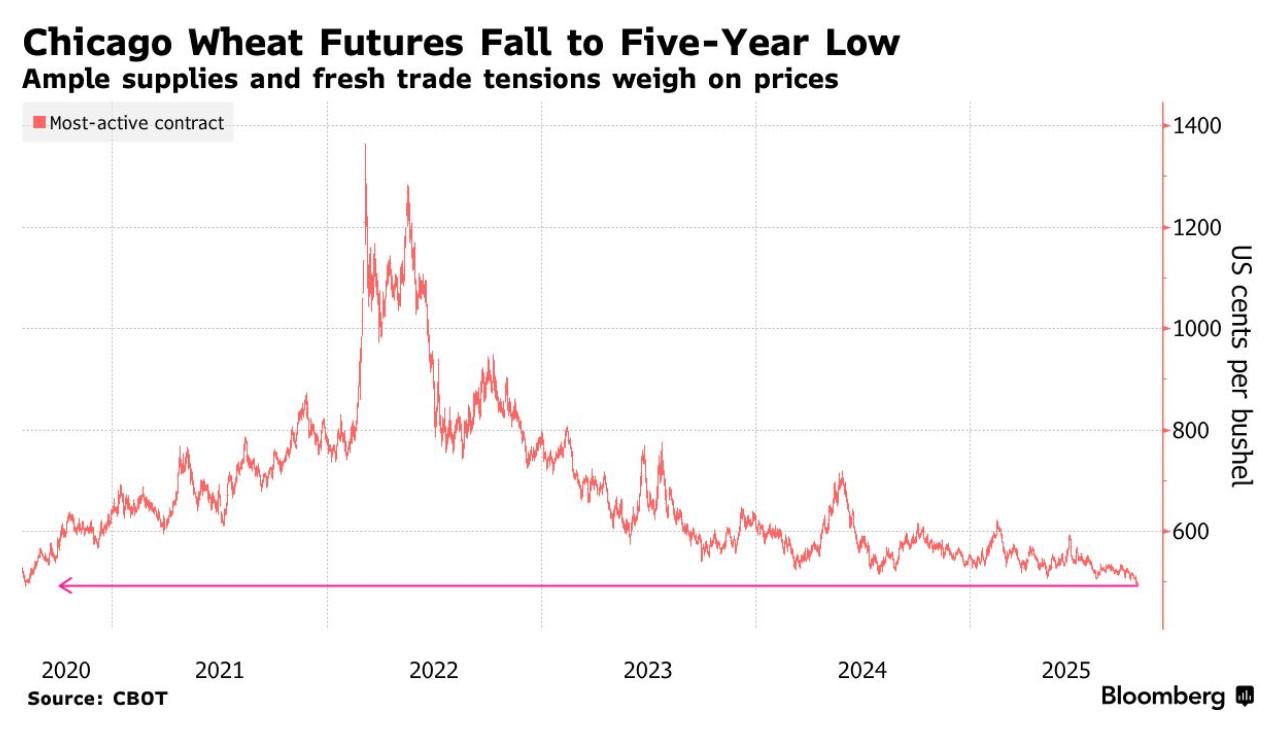 Ціна на пшеницю падає четвертий день поспіль, досягнувши найнижчого рівня з 2020 року, на тлі покращення прогнозів поставок та відновлення торговельної напруженості між США та Китаєм.