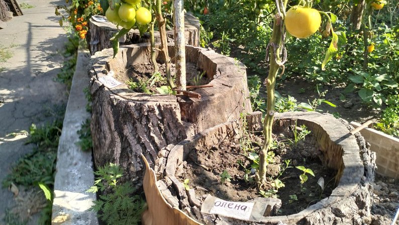 “Вирішив його зрізати й вийшли пеньочки. Колись я у Тернополі у сватів, бачив, що у пеньочках ростуть квіти. Я вирішив спробувати помідори. Вони дуже прижилися і їм комфортно. Тому що я пробував різні варіанти у відрах, воно нагрівається і помідор там не дуже почувався”, — пояснив Михайло Ігнатюк.