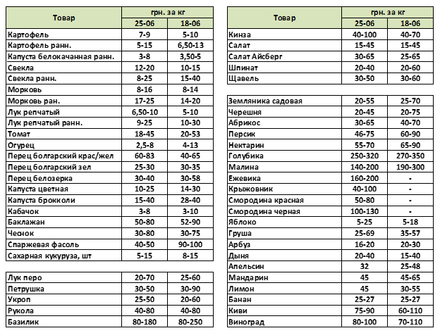 Ціни на фрукти і ягоди продовжують знижуватися. Виняток склали лише дині та яблука, що здорожчали. При цьому ціни на яблука підвищилися лише в максимальному діапазоні на якісні фрукти. З’явилися цінові пропозиції на смородину, аґрус і ожину.