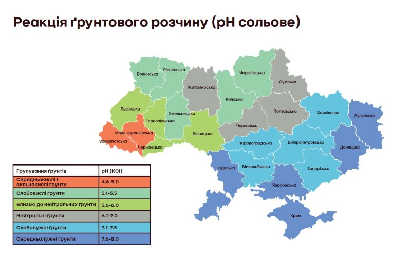 На дефіцити ґрунтів потрібно дивитися не лише з точки зору кількості того чи іншого елемента – потрібно розуміти їхню доступність, – наголошує Сергій Сальніков. – А вона залежить від показника рН ґрунту. Майже 62% ґрунтів України є кислими, а тому більшість поживних елементів в них блокуються. Це особливо актуально для Півночі та Заходу (Чернігівська, Сумська, Львівська, Волинська області). Проблема надмірної лужності (>8.1) є менш масовою (загалом 2.2%), проте гостро стоїть у Дніпропетровській та Миколаївській областях, що часто призводить до дефіциту заліза та марганцю. А деякі регіони, як-от Волинська область, мають надзвичайно широкий діапазон значень рН – від дуже сильнокислих (<4.1) до середньолужних (до 8.0), що ускладнює уніфікацію агротехнічних заходів та потребує індивідуального підходу до кожного окремого поля».