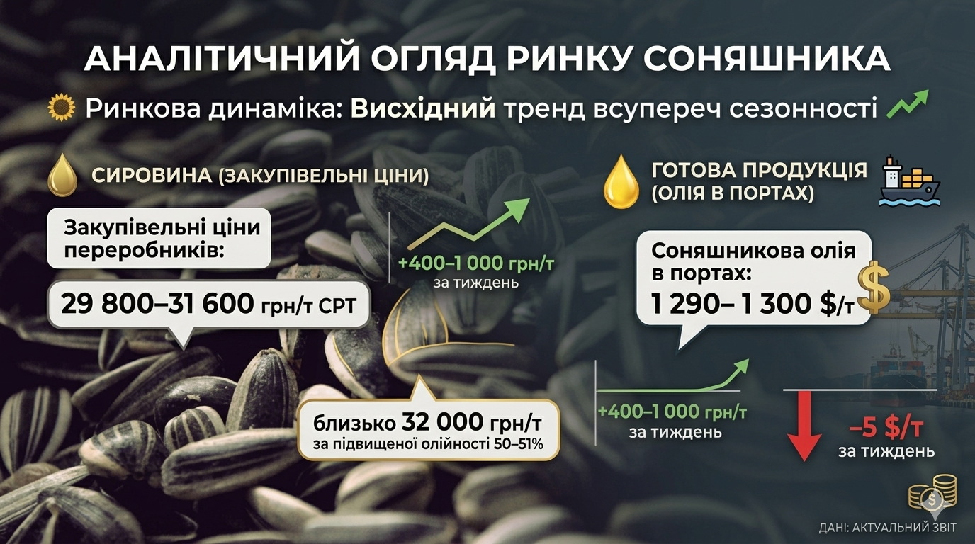 На українському ринку соняшника зберігається висхідна цінова динаміка, що суперечить традиційній сезонній моделі. Закупівельні ціни переробників сягнули 29 800–31 600 грн/т СРТ залежно від регіону, а за підвищеної олійності 50–51% окремі контракти фіксувалися на рівні близько 32 000 грн/т. За тиждень ціни на сировину зросли на 400–1 000 грн/т. Водночас соняшникова олія в портах за той самий період знизилася в середньому на 5 $/т — до 1 290–1 300 $/т.