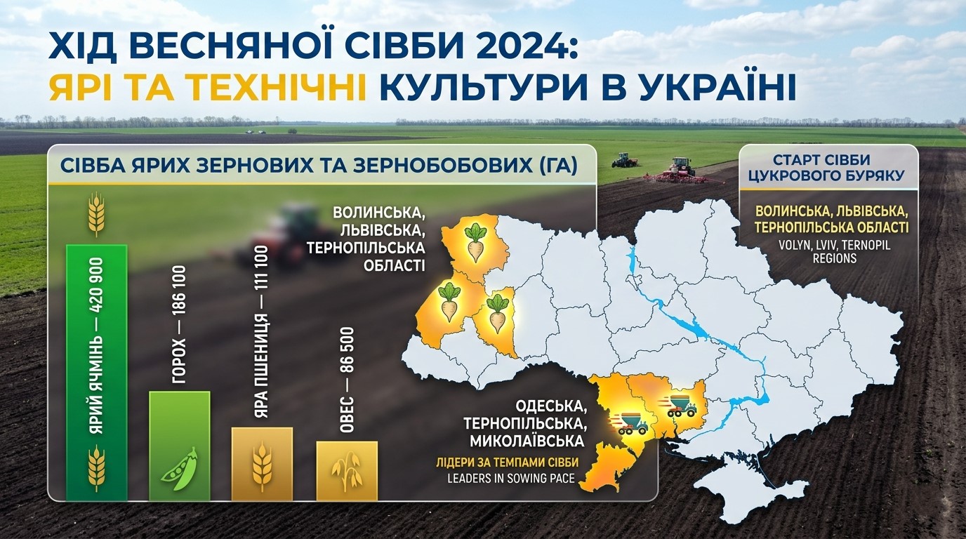 Ярий ячмінь — 420 900 га, горох — 186 100 га, яра пшениця — 111 100 га, овес — 86 500 га. Паралельно в окремих регіонах розпочато сівбу технічних культур — цукрового буряку на Волині, Львівщині та Тернопільщині. Лідери за темпами — Одеська, Тернопільська та Миколаївська області.