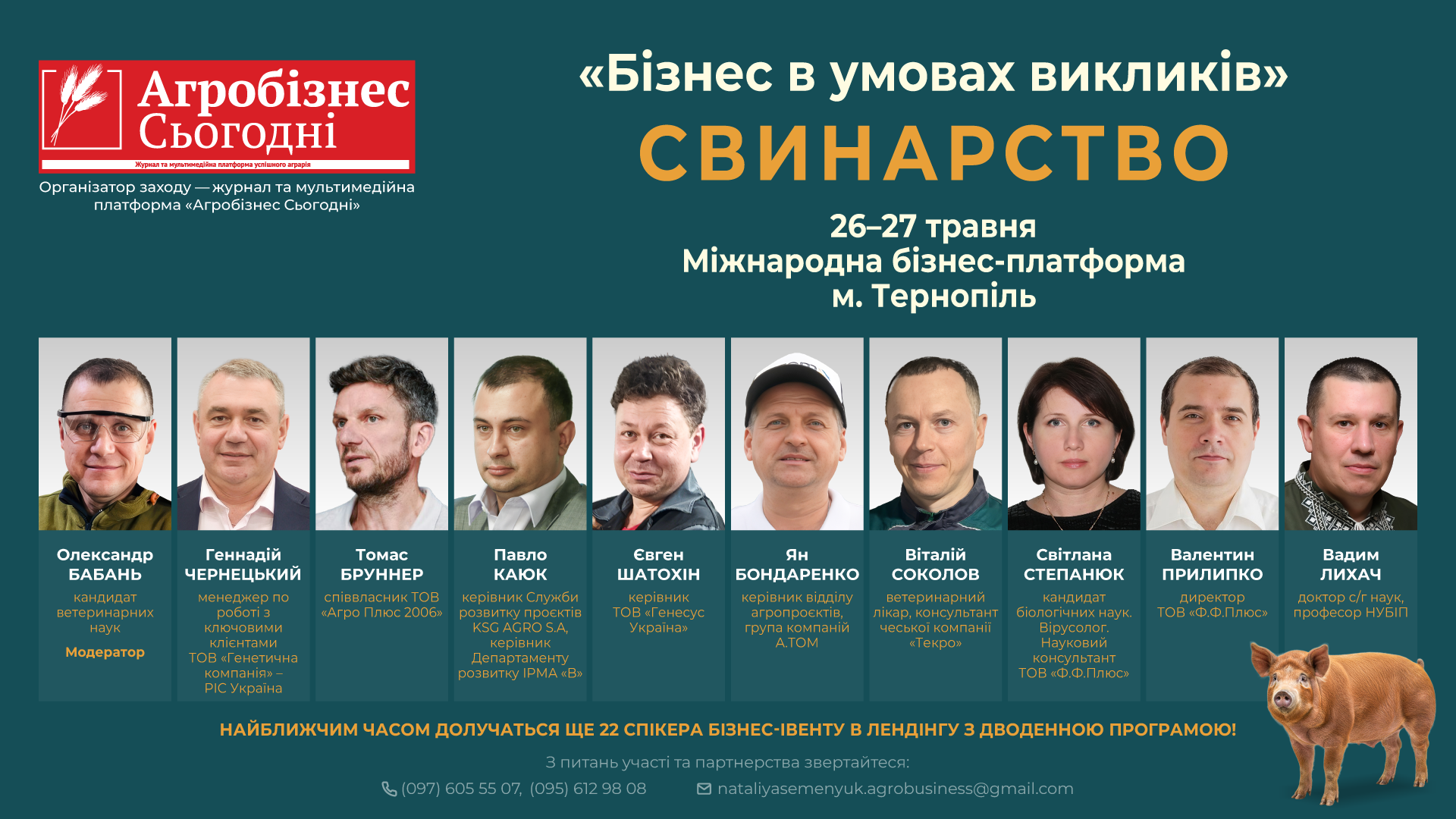 26-27 травня в Тернополі Міжнародна бізнес-платформа відбудеться галузевий бізнес-івент «Бізнес в умовах викликів». Свинарство», організований журналом та мультимедійною компанією «Агробізнес Сьогодні», присвячений сучасному розвитку промислового свинарства в Україні.
