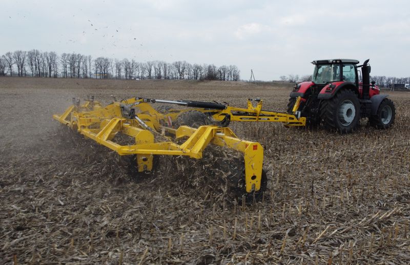 Одним із варіантів був поверхневий обробіток стерні подрібнюючим котком BEDNAR DURACUT TE12400 на глибину 3–4 см. Його робота полягала у подрібненні решток і частковому перемішуванні їх із верхнім шаром ґрунту, що прискорює мінаралізацію рослинних решток. Леза котка зі сталі HARDOX витримують інтенсивне навантаження, а конструкція дозволяє працювати на високій швидкості. Після проходу DURACUT на поверхні формується шар мульчі, який зменшує вітрову ерозію і поступово мінералізується.