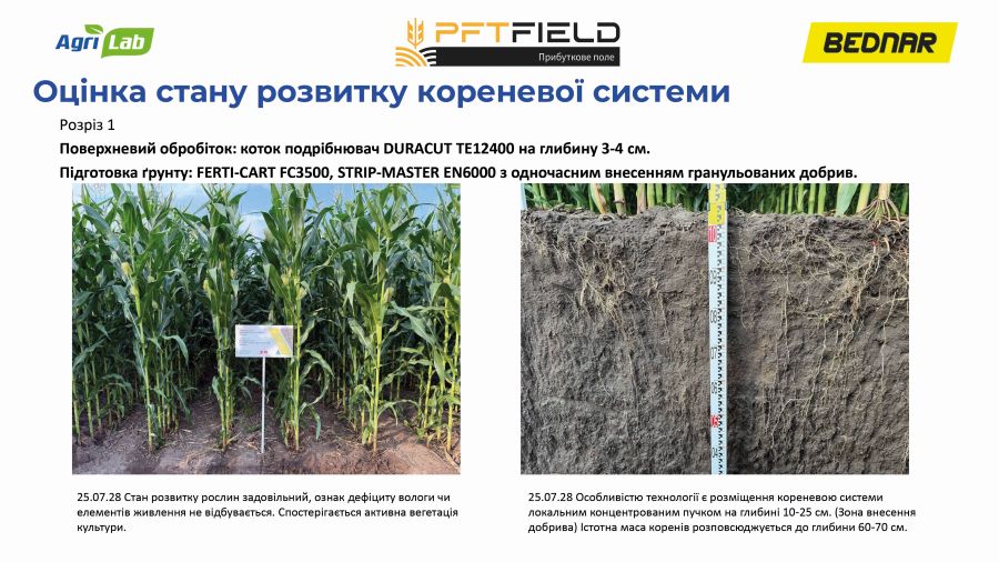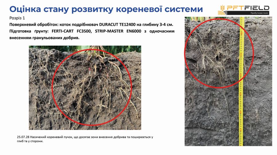 Наприкінці липня були проведені розкопки. Стан рослин оцінювали як задовільний, ознак дефіциту вологи чи елементів живлення не спостерігали, культура активно вегетувала. У варіанті з котком DURACUT та культиватором STRIP-MASTER коренева система формувала концентрований пучок на глибині 10–25 см — у зоні внесення добрив. Значна частина коренів проникала на 60–70 см, частина розповсюджувалася у міжряддя. У межах оброблюваної смуги корені розвивалися приблизно до 25 см у глибину і до 20–25 см у сторони від зони активного обробітку.