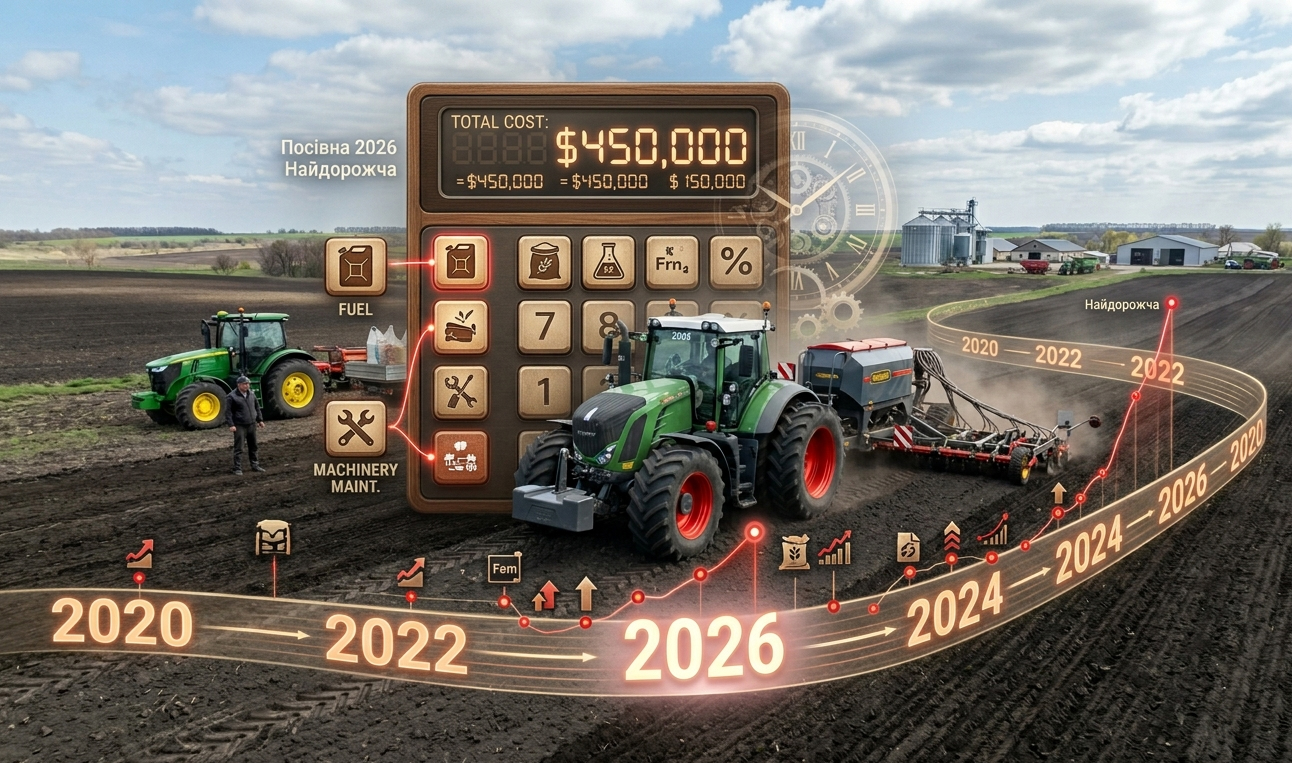 Посівна 2026 року — найдорожча за останні роки. Витрати на гектар коливаються від 25 000 до 40 000 грн залежно від культури та регіону. Азотна група добрив подорожчала на 34–35% порівняно з минулим роком. Дизель по 90 грн/л додає до витрат на кожен гектар суттєву суму. За оцінками аналітиків УНІАН загальне зростання витрат фермерів сягнуло 17–18% — і це ще до підсумків посівної.