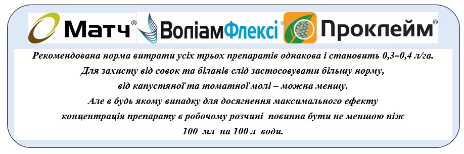 Практичною рекомендацією для визначення своєчасності проведення обприскувань і забезпечення максимальної овіцидної дії інсектицидів, якою користується переважна більшість виробничників, є наступне: інсектицид МАТЧ® необхідно застосувати протягом 4 днів від початку масового вильоту метеликів молей, совок або біланів.
