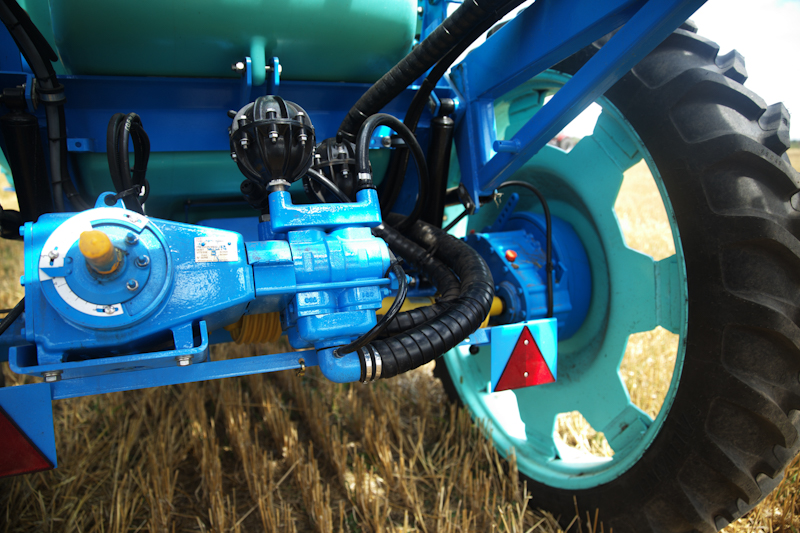 Насос-дозатор VOLUX (патент BERTHOUD) з приводом від колеса обприскувача через карданний вал забезпечує постійну норму витрати в л/га, незалежно від швидкості руху машини. Тут — поршневий насос подвійної дії продуктивністю 240 л/хв або опційно — на 320 л/хв.
