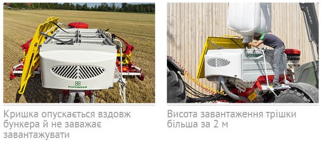 Бак закривається справді зручною та надійною кришкою. Геометрія відкривання продумана таким чином, що кришка не просто підіймається, а й опускається вздовж одного з бортів. Яким би методом ви не завантажували посівний комплекс, ви не маєте жодних ризиків пошкодити кришку. А завантажувати його справді зручно будь-яким приладдям. Висота завантаження трішки більша за 2 м. Ширина отвору для завантаження — 1,92 м. Це зручно робити навіть ковшем до 1,8 м завширшки. Завантажувальний отвір прикрито сіткою, на якій лишаться всі сторонні предмети. На цю сітку встановлено ультразвуковий датчик, що вимірює відстань до посівного матеріалу та передає на термінал дані про кількість посівного матеріалу в баку. Це дозволяє трактористу вчасно під’їхати на завантаження.