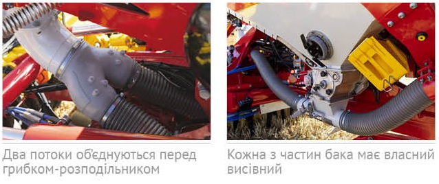 Великий бак на 2 800 л розділено поздовжньо навпіл. Розкладна платформа з драбиною, розміщена з лівого боку, забезпечує хороший доступ до бункера для завантаження. Обидві частини бака мають свої дозатори. Це дає можливість висівати два види посівного матеріалу чи посівний матеріал із добривами, або ж використовувати 100% бункера для одного насіння. Турбіна, що потребує потоку оливи 35 л/хв, розташована високо в зоні без пилу. Потік повітря від турбіни роздвоюється, підхоплює матеріал, відміряний висівними, та знову об’єднується перед грибком-розподільником. Оскільки в системі є точки об’єднання потоків повітря, то є потреба в абсолютно однаковій потужності цих потоків (інакше можуть утворюватися турбулентні пробки). Рівність потоків забезпечується герметичністю насіннєвого бака. В баку над висівним і в потоці повітря під висівним установлено датчики тиску, що порівнюють свої значення. Якщо верхню кришку бункера закрити не щільно, то тракторист на моніторі отримає сигнал про проблеми з герметичністю.