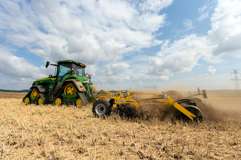 Наш 6-метровий агрегат SWIFTERDISC працює з тракторами John Deere 8430 або 7930. Працюємо на глибині 5-7 або 12-14 см в залежності від задачі. Витрати палива в середньому становлять 7 л/га. Зазвичай дисковий агрегат працює після збирання пшениці, ячменю, соняшнику і кукурудзи. Якщо рослинних решток багато, доводиться працювати у 2-3 сліди. Цього цілком достатньо для того, аби у поле заходила сівалка. Після зернових культур достатньо одного проходу, якщо планується подальша обробка. А так, щоб одразу можна було сіяти, потрібно зробити два проходи.