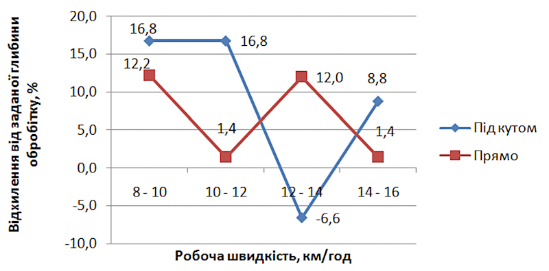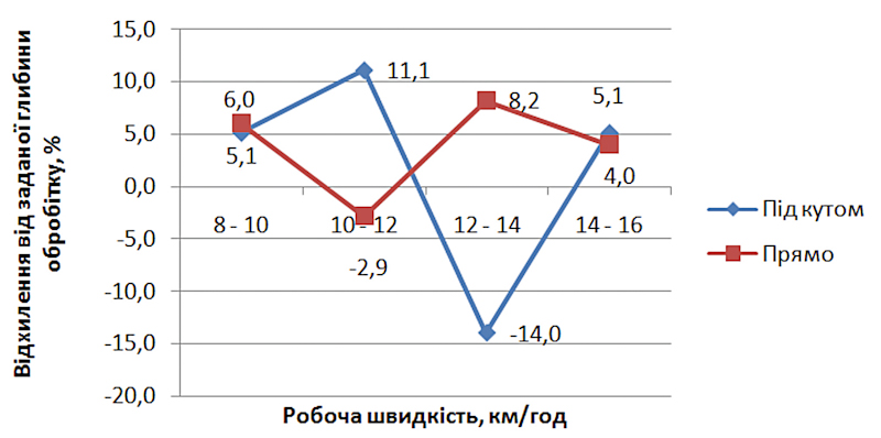 За напрямку руху агрегата під кутом 35° до рядка значення величин відхилень також збільшувались зі збільшенням глибини обробітку. Для всіх глибин обробітку (7 см, 10 см) найменші відхилення (–14%, –6,6%) були зафіксовані за швидкості руху агрегата 12–14 км/год. Від’ємні значення величини відхилень для глибин обробітку 7 та 10 см вказують на те, що диски борони заглиблювались понад установлені під час налаштування агрегата межі. Слід зазначити, що за обох напрямків руху агрегата значення відхилень від заданої глибини обробітку не перевищували встановлені агротехнічні вимоги 20 см, окрім обробітку на глибину 14 см.