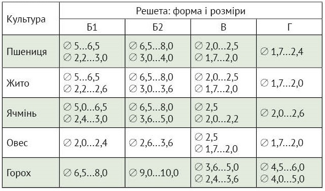 Форма і розміри отворів решіт зерноочисних машин первинного очищення