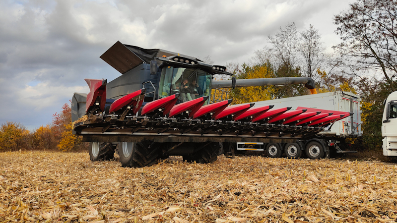FENDT IDEAL у господарстві збирає кукурудзу з 12-рядною жаткою. Загалом машина розрахована на роботу з жатками різної ширини — довжина, як відомо, залежить від рельєфу поля та врожайності культури на полі.