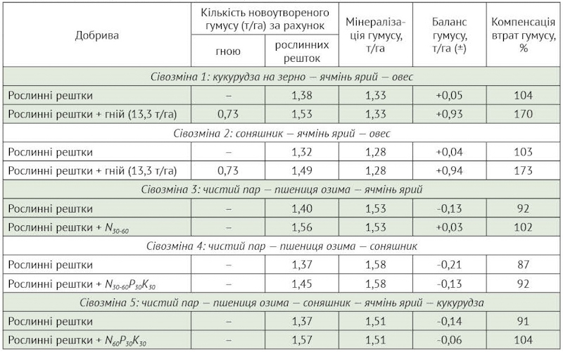 Водночас, згідно з математичними розрахунками, унесення рослинних решток підтримує бездефіцитний баланс гумусу тільки на мінеральному фоні та коли під зерновими культурами (пшеницею, ячменем) у структурі посіву більше як 65%. Особливо помітно витрати органіки зростали у паро-зерно-просапній сівозміні з підвищеним рівнем мінералізації в полі чистого пару (2 т/га/рік) і соняшнику (1,30 т/га/рік). Річне компенсаційне відшкодування становить усього 87–92%.