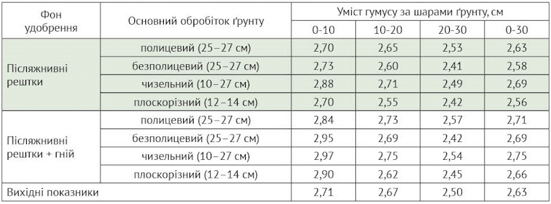 У 3-пільних сівозмінах із чистим паром системне використання як органічного добрива усієї вторинної продукції рослинництва як самостійно, так і сумісно з туками (N30-60, N30-60P30K30) утримувало родючість орного ґрунту за вмістом гумусу на початковому рівні, близькому до позначки 4,2%. Відхилення від цього показника коливалось за варіантами у межах 0,01–0,17% і не перевищувало НІР05 (0,21%). До того ж спостерігалась тенденція до покращення гумусного стану верхнього шару чорнозему (0–10 см) за мілкого безполицевого (мульчувального) обробітку, порівнюючи з оранкою на зяб. Більшою мірою ця закономірність притаманна комбінованому фону (післяжнивні рештки + NPK).