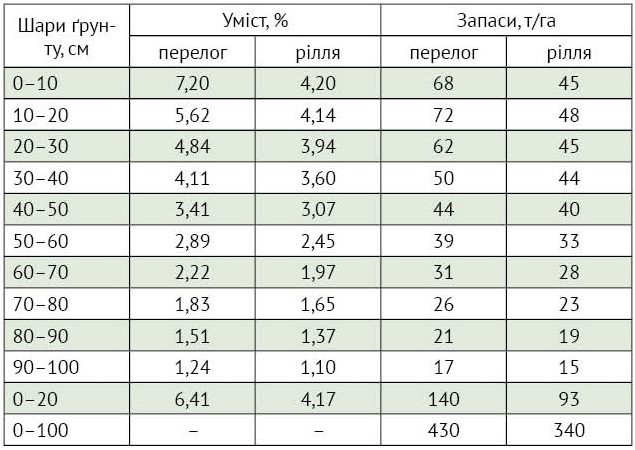 Згідно з аналітичними даними, уміст гумусу в орному шарі перелогу (умовний еталон) класифікується як високий (6,41%), а ріллі — як середній (4,17%). Тобто різниця за варіантами становить 2,24%, а його щорічні втрати за тривалого сільськогосподарського використання ділянки досягають 0,041%. Аналогічні тенденції стосуються також запасів органіки в ґрунті. Відповідно до оцінювальної шкали староорна ділянка мала низький рівень накопичень, які для шару 0–20 см становили 93 т/га, перелог — середній (140 т/га). Загалом кількість гумусу в орному шарі до еталона за вмістом зменшилась на 35%, а його запаси — на 34% (табл. 3).