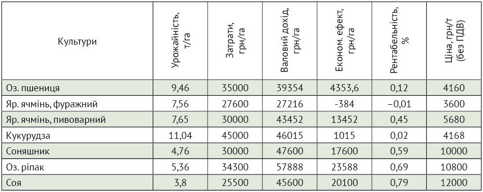 Публікації у фахових виданнях, соціальних мережах, а також спілкування з фермерами свідчать про те, що здебільшого вирощування традиційних зернових культур — озимої пшениці, ярого ячменю, кукурудзи — 2023 року виявилося збитковим. Позитивні економічні результати отримали переважно за вирощування олійних культур: ріпаку, соняшнику, сої, пивоварного ячменю. Така сама тенденція простежується і в наших дослідженнях, проведених на агроплатформі Лімагрейн у Вінницькій області (табл. 1).