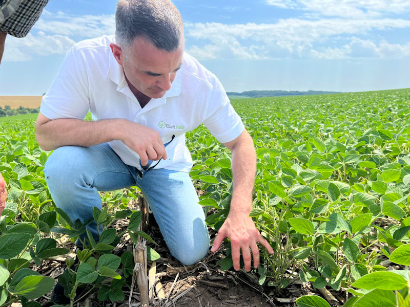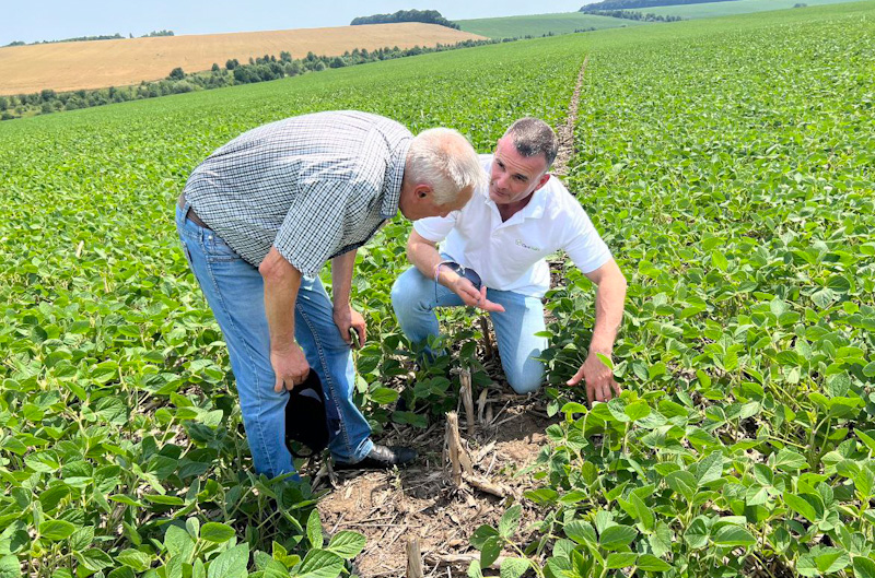 Жерар де ля Саль, регіональний керівник Elicit Plant в Україні, разом з клієнтом з Черкаській області оглядають посіви сої, оброблені препаратом Best-a