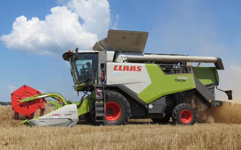 CLAAS TRION 650 — це зернозбиральний комбайн середнього класу продуктивності з двигуном Cummins, потужністю 354 к. с. і бункером для зерна на 10 500 л.