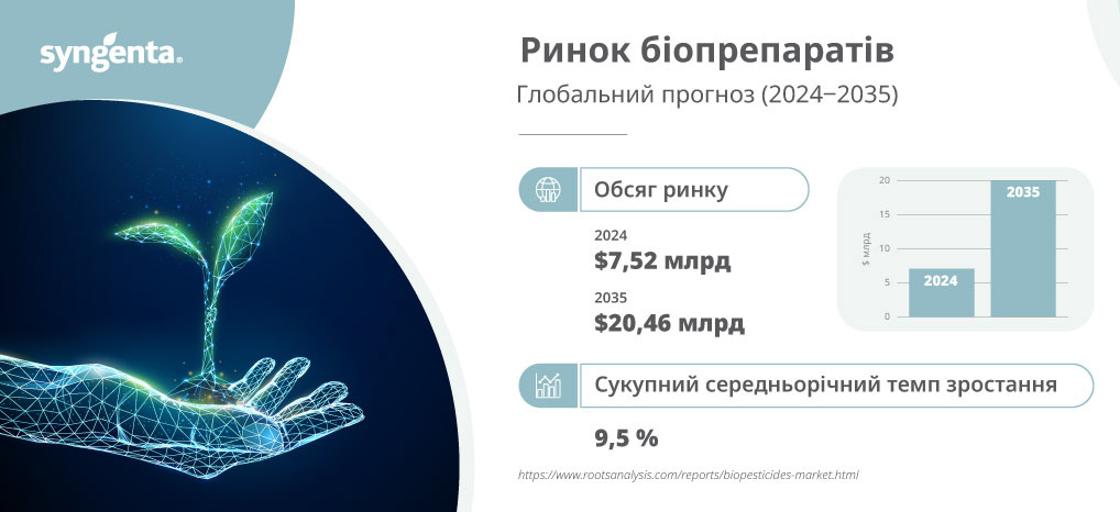 На сьогодні ринок біопестицидів один із тих, що мають найстрімкіший розвиток, показуючи середні щорічні темпи зростання 9,5%. За прогнозами аналітиків, уже до 2035 року він має досягти $20,46 млрд і займе понад 10% світового пестицидного ринку. Якщо розглядати територіально, то найбільший ринок біопрепаратів сконцентровано в Північній Америці — близько 44%. Проте і Європа не відстає. Завдяки суворій нормативно-правовій базі та наполегливому заохоченню сільськогосподарських виробників до використання біологічних засобів захисту рослин замість синтетичних, їх частка стрімко зростає. Крім того, європейські споживачі добре обізнані у питаннях безпечності харчових продуктів та захисту навколишнього середовища, що стимулює попит на органічні та продукти без пестицидів. Серед усього різноманіття біологічних засобів захисту рослин на європейському ринку найбільш популярними є біофунгіциди. Переважно це мікробіологічні продукти на основі штамів Bacillus, Trichoderma, Streptomyces і Pseudomona, які ефективно діють проти таких збудників, як Pythium, Rhizoctonia, Fusarium, Sclerotinia, Thielaviopsis, Botrytis та Erysiphales.