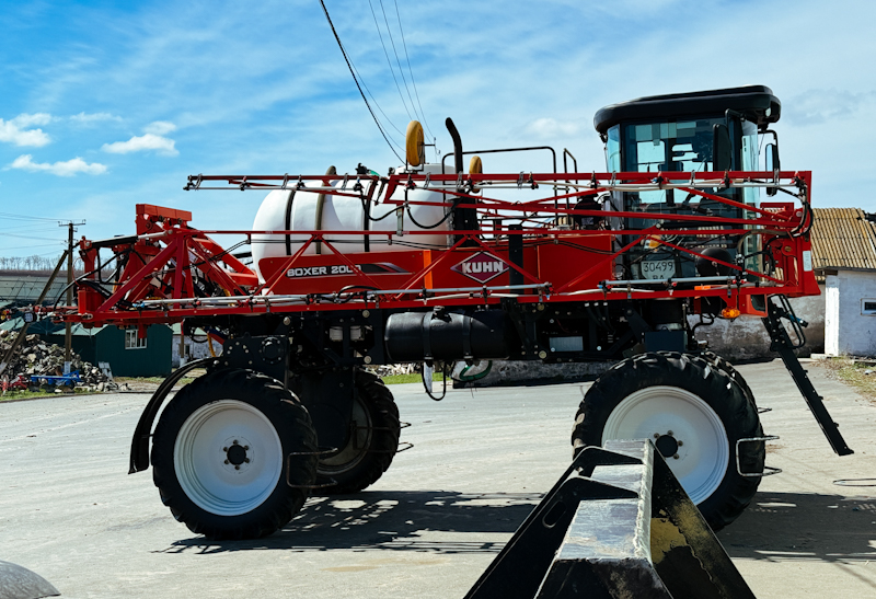 Самохідний обприскувач KUHN Boxer має бак на 2000 л й оснащується штангами завширшки 25 або 27 м. Фіксований кліренс — 1,4 м, а ширина колії змінюється «перекиданням» коліс і може становити 2,5 та 2,8 м, що добре підходить для роботи по міжряддях 70 см. Крім того, велике значення має те, що колеса обладнані трубчатими розділювачами рядків, що запобігає травмуванню таких культур як соняшник та кукурудза при їх обробці. Не всі виробники самохідних обприскувачів мають таку опцію. Висота штанги може змінюватись від 0,6 до 2,1 м.