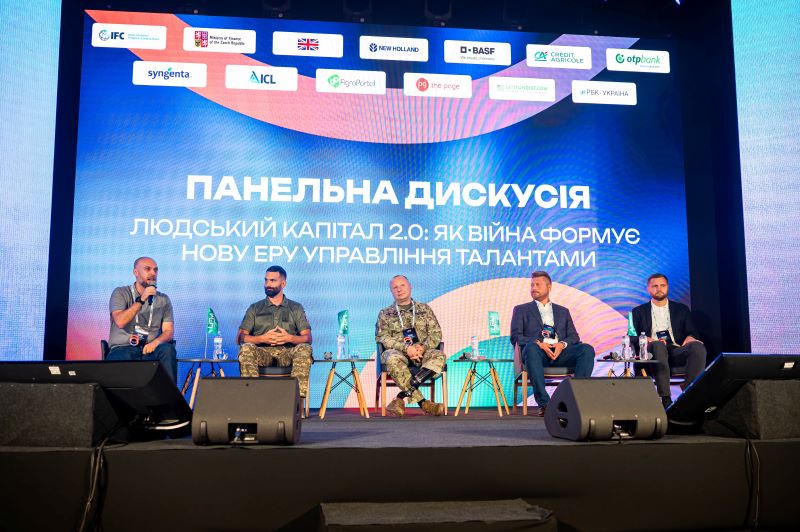 Дискусія перейшла до панелі «Людський капітал 2.0: як війна формує нову еру управління талантами». Старший партнер Korn Ferry Роман Бондар разом із начальником штабу 412 полку безпілотних систем Nemesis Артемом Бєлєнковим, засновником компаній FinStream та Cronvest, головою Асоціації підприємців-ветеранів АТО, старшим лейтенантом Національної гвардії України, командиром взводу спеціального призначення Сергієм Позняком, в.о. голови правління АТ «ОПЗ» Юрієм Ковальським та HRD напряму Агро МХП Сергієм Ніколаєвим обговорили, як змінюються підходи ро лідерства, розглянули ключові кадрові виклики для агробізнесу, подискутували про стратегії воєнної адаптації та реінтеграції ветеранів.