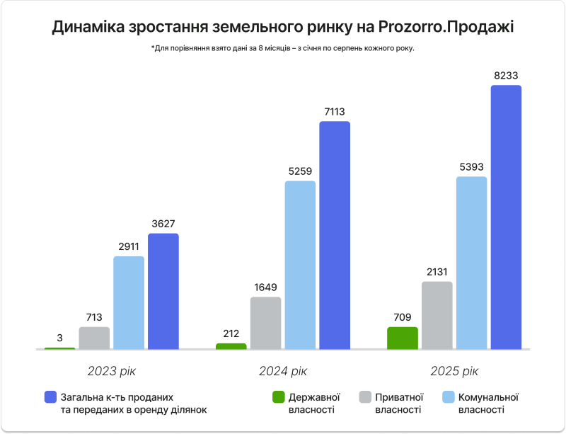 Це свідчить: ринок не тільки зберіг стабільність, а й демонструє зростання. Бізнес активно бере участь в земельних торгах завдяки прозорим умовам та потенціалу розвитку.