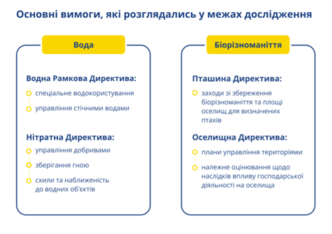 У межах дослідження ми детально проаналізували вимоги, відповідність та ставлення фермерів/-ок у межах напрямків «Вода» і «Біорізноманіття», зокрема це стосується питань, які покриваються Водною Рамковою, Нітратною, Оселищною та Пташиною Директивами ЄС.