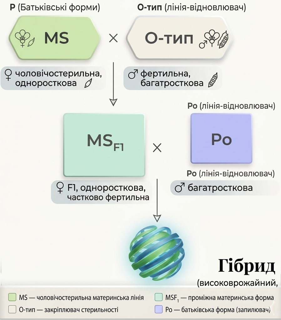 - Перша — чоловічостерильна материнська лінія (MS). Вона не здатна до самозапилення, що є ключовою умовою контрольованого схрещування.