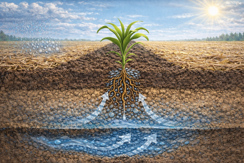 Смуговий обробіток ґрунту сприяє швидкому проникненню дощової води в рядок та відповідно зону кореневої системи. Вода, що зберігається глибше, менше втрачається через випаровування на початку вегетації, що особливо важливо в періоди нерегулярних опадів. Водночас структура ґрунту в необробленій зоні залишається стабільною. Капілярність зберігається, а з нею і здатність води підніматися з нижніх шарів, яку рослини будуть використовувати на пізніших стадіях росту.