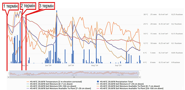 Рис. 1. Погодні умови впродовж вегетаційного періоду соняшнику 2024 року