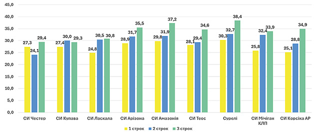 Також зафіксовано вплив термінів сівби на вміст олії в гібридах соняшнику. У гібридів СИ Купава, СИ Арізона, СИ Амазонія, СИ Теос, Сурелі, СИ Мічіган КЛП, СИ Корсіка АР вміст олії стабільно збільшувався за зміщення термінів від ранніх до пізніх оптимальних. Різниця в олійності між раннім і пізнім оптимальним сягала в гібрида СИ Арізона 4,5 %, у гібрида СИ Корсіка АР — 3,6% (рис. 3).