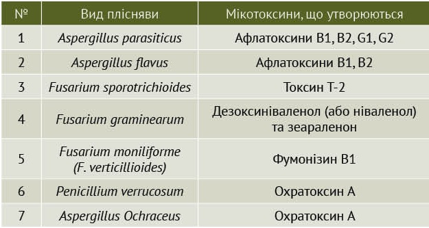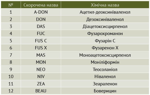 Таблиця 1. Назви основних мікотоксинів, що продукуються видами Fusarium