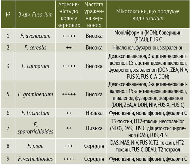 Таблиця 2. Найважливіші види Fusarium, що інфікують зернові культури, та основні мікотоксини, які вони продукують